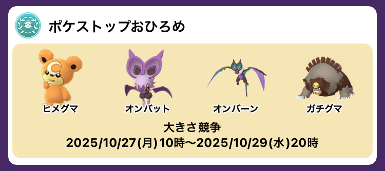 ![]() ポケストップおひろめ(「グレートな相棒」以上のポケモン) | 8月11日(月) 10時 から 8月12日(火) 19時 59分 |