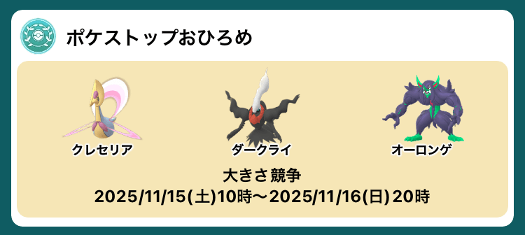 ![]() Pokémon GO City Safari 2025(シティサファリ2025年9月) | 9月27日(土) 10時 から 9月28日(日) 18時 |