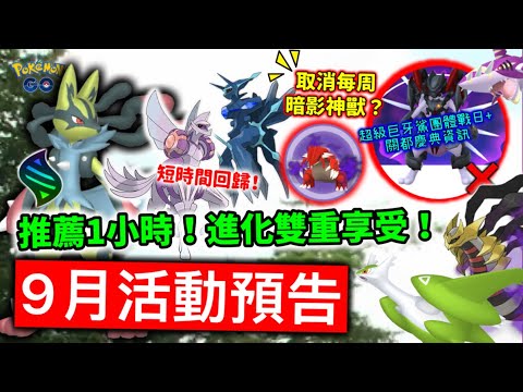 9月活動詳細內容‼️取消每周暗影神獸?沒有裝甲超夢!起源雙龍短時間回歸!暗影起源騎拉帝納?推薦1小時進化雙重享受!超級巨牙鯊團體戰日+ 關都慶典資訊Pokémon Go September2025